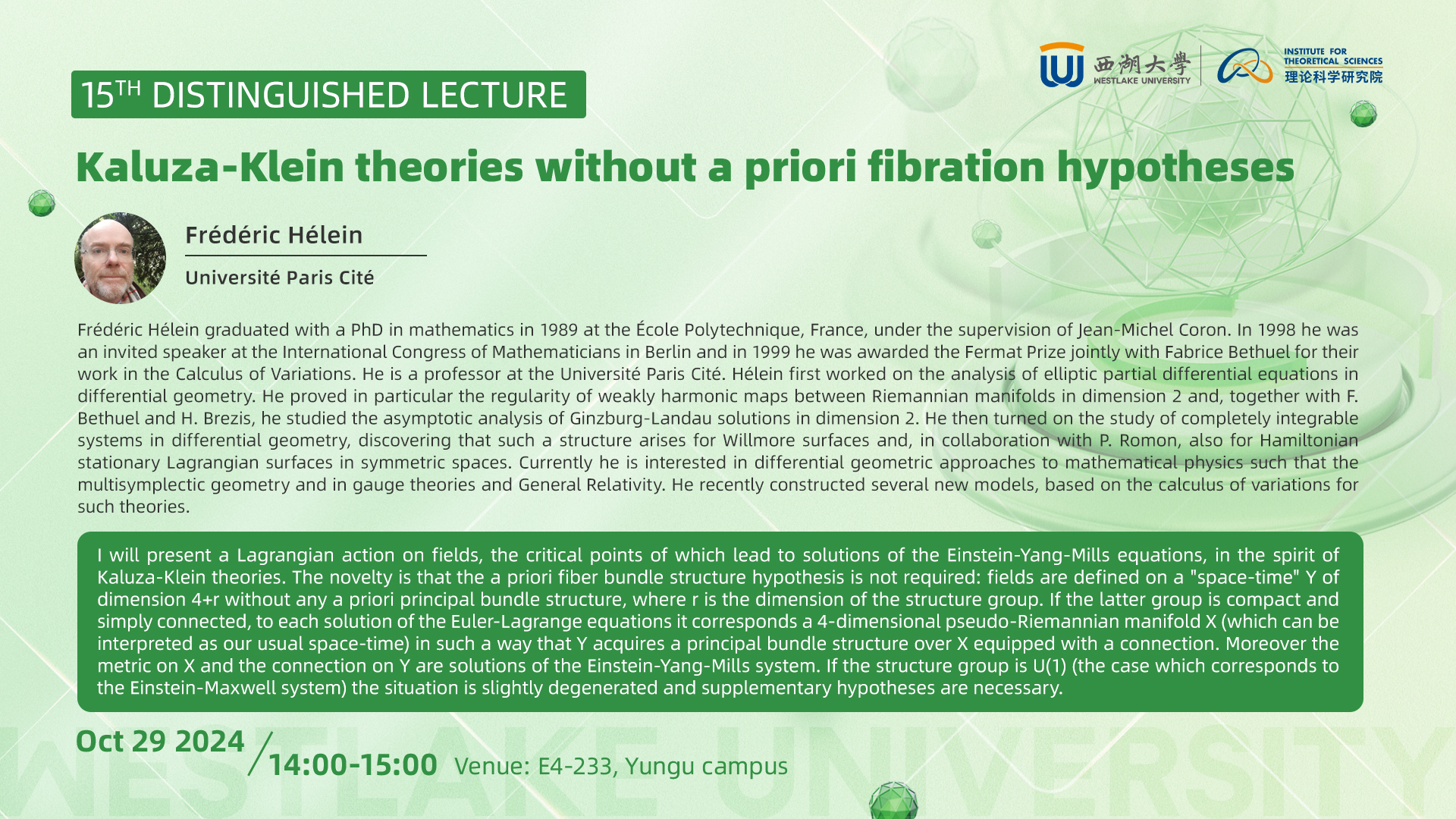 Biography: Frédéric Hélein graduated with a PhD in mathematics in 1989 at the École Polytechnique, France, under the supervision of Jean-Michel Coron. In 1998 he was an invited speaker at the International Congress of Mathematicians in Berlin and in 1999 he was awarded the Fermat Prize jointly with Fabrice Bethuel for their work in the Calculus of Variations. He is a professor at the Université Paris Cité. Hélein first worked on the analysis of elliptic partial differential equations in differential geometry. He proved in particular the regularity of weakly harmonic maps between Riemannian manifolds in dimension 2 and, together with F. Bethuel and H. Brezis, he studied the asymptotic analysis of Ginzburg-Landau solutions in dimension 2. He then turned on the study of completely integrable systems in differential geometry, discovering that such a structure arises for Willmore surfaces and, in collaboration with P. Romon, also for Hamiltonian stationary Lagrangian surfaces in symmetric spaces. Currently he is interested in differential geometric approaches to mathematical physics such that the multisymplectic geometry and in gauge theories and General Relativity. He recently constructed several new models, based on the calculus of variations for such theories.